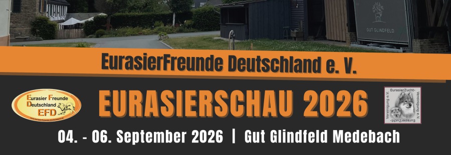 Am Samstag, den 05.09.2026 findet in Medebach-Glindfeld im Gut Glindfeld die Eurasierschau statt. Es wird die 12. gemeinsame Eurasierschau der EurasierFreunde-Deutschland e.V. und der EurasierZucht-Vereinigung e.V.